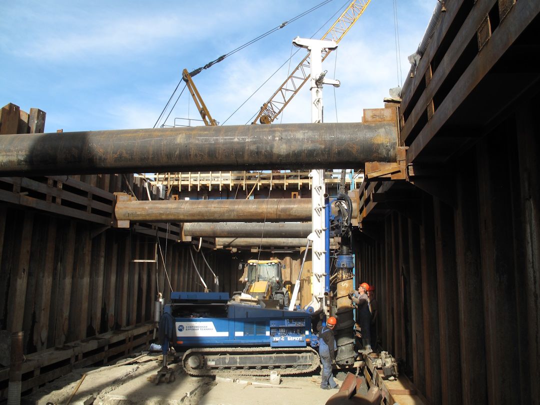 При устройстве системы водопонижения на объекте было пробурено и оборудовано 24 водопонизительных скважин, смонтирована 1 иглофильтровая установка. Все работы выполнялись собственными силами. Эксплуатация системы водопонижения длилась около года.