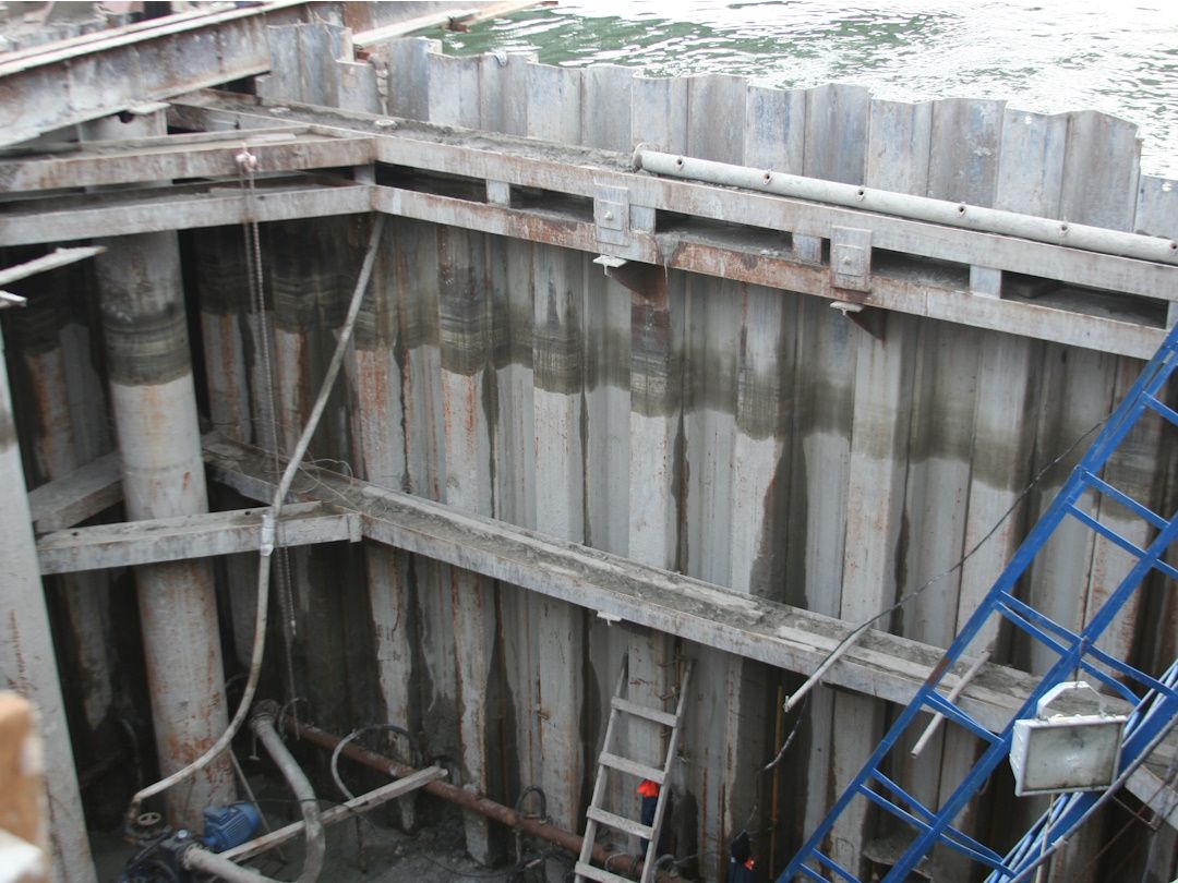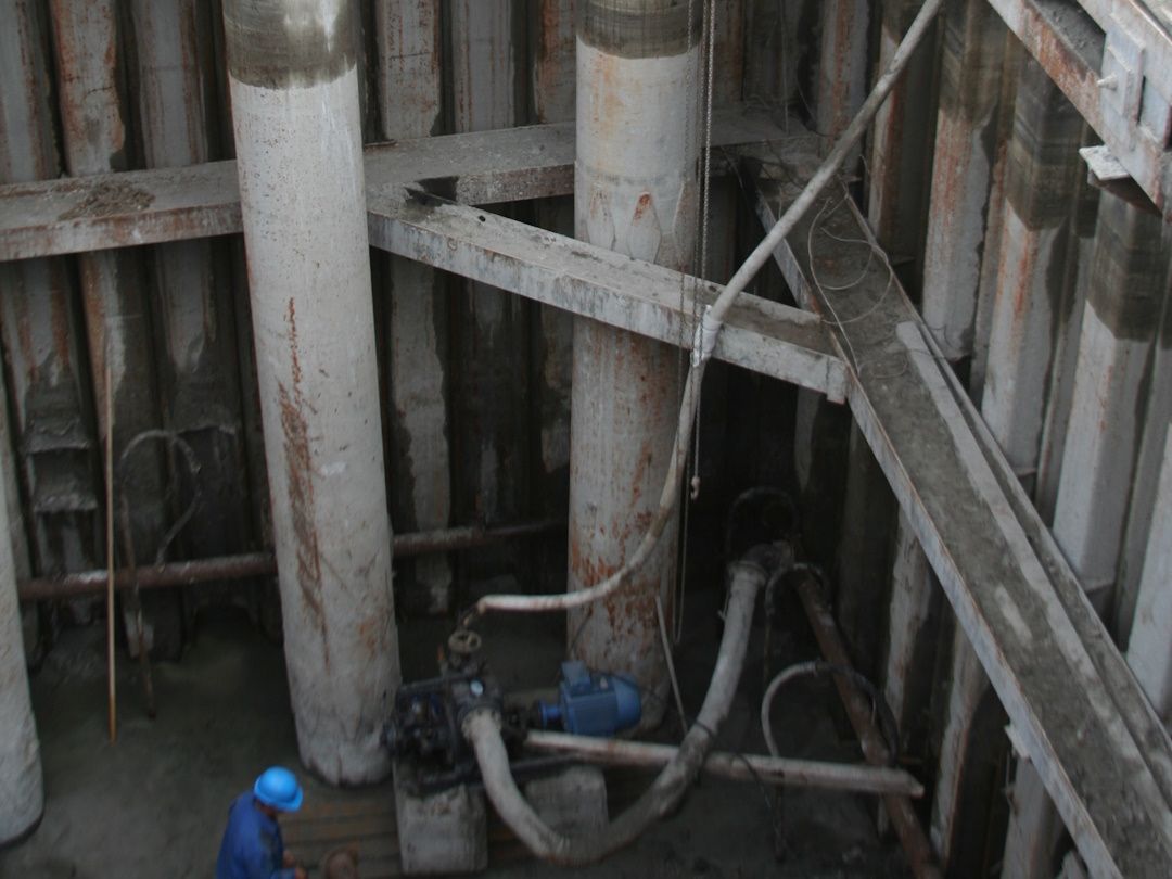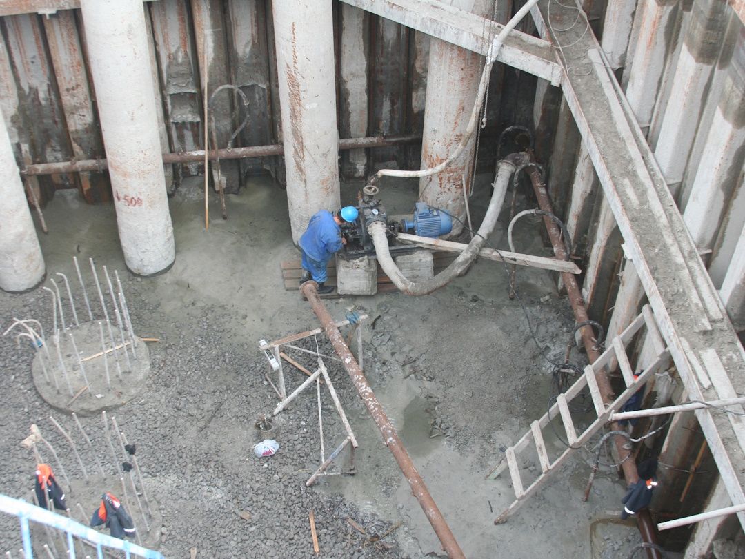 При устройстве системы водопонижения на объекте было пробурено и оборудовано 18 водопонизительных скважин, смонтировано 2 иглофильтровые установки. Все работы выполнялись собственными силами. Эксплуатация системы водопонижения длилась около года.