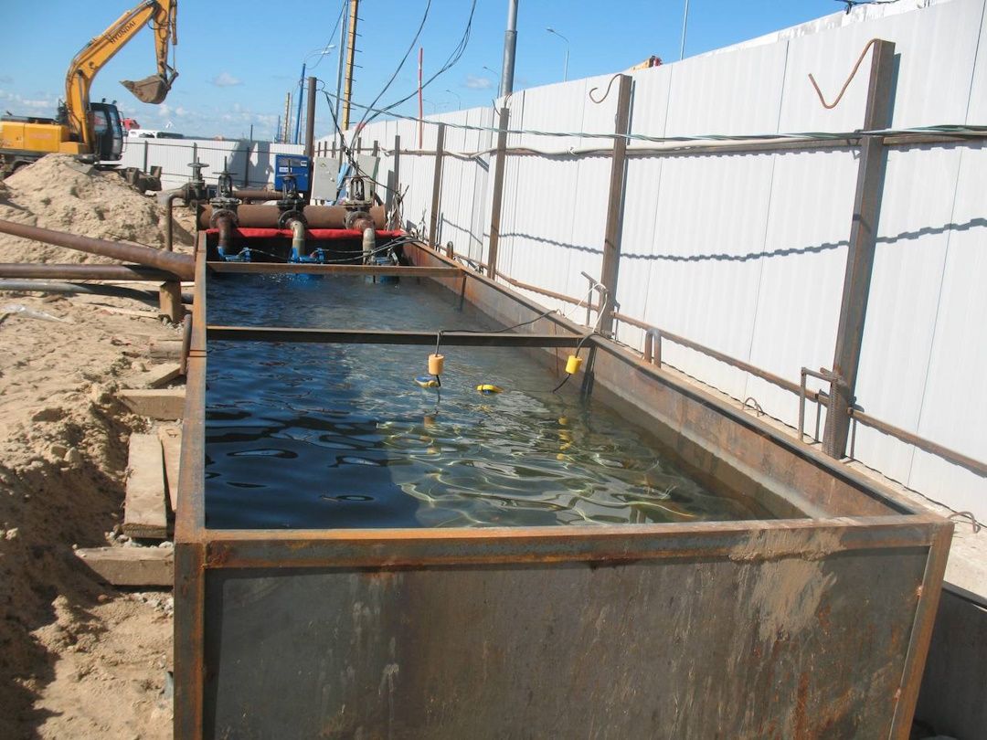 При устройстве системы водопонижения на объекте было пробурено и оборудовано 16 водопонизительных скважин, смонтировано более 1000 метров сбросных трубопроводов, выполнен полный комплекс электромонтажных работ Все работы выполнялись собственными силами. Эксплуатация системы водопонижения длилась около года.